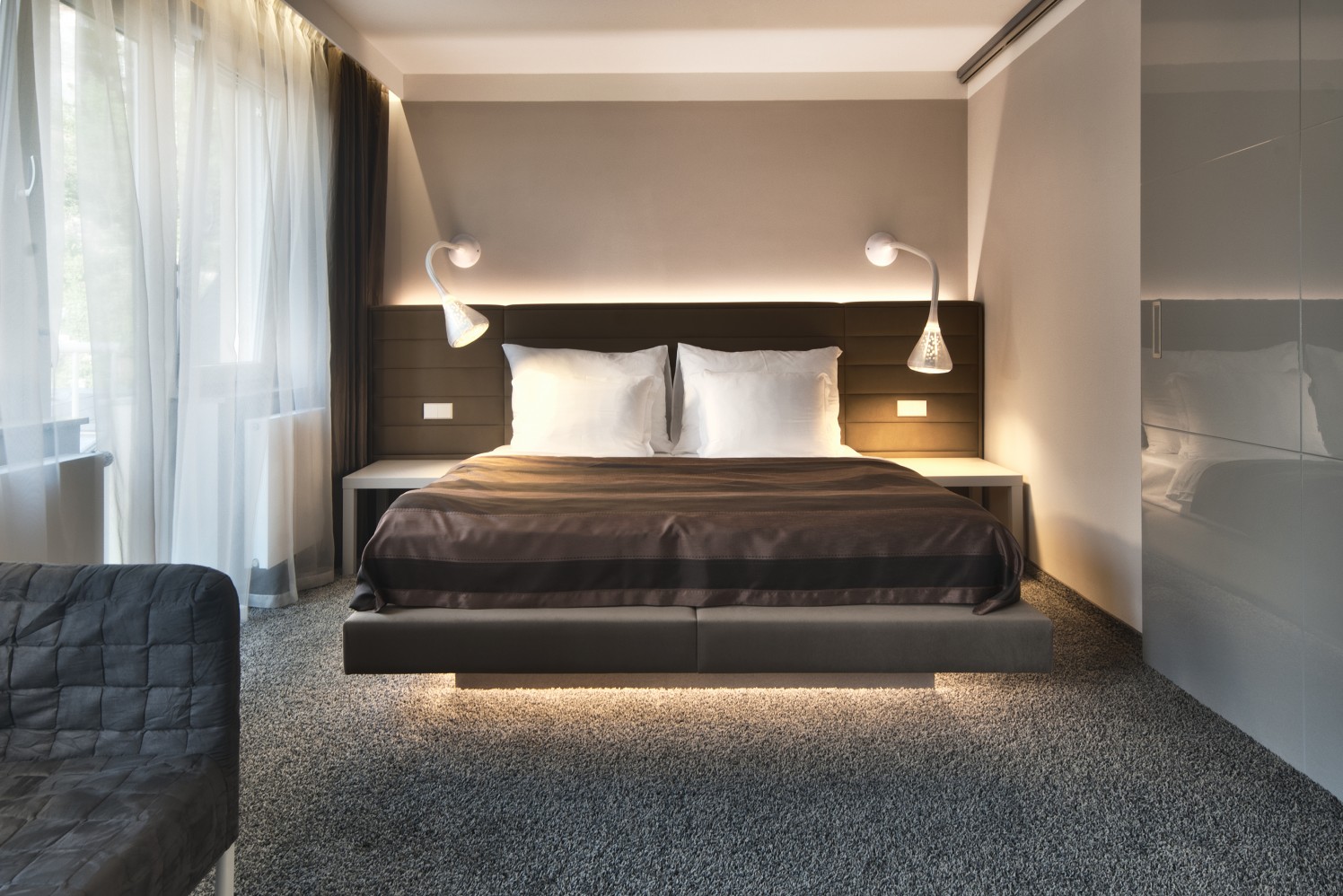 Zimmergröße 32 m² Zimmerbeschreibung: Komfort und modernes Design. Alle Betten sind mit Gesundheitsmatratzen. Mit Doppelbett - King-Size (1 Bett 200x200cm, 1 große Matratze). In diesem Zimmer kann ein Zusatzbett gebucht werden. Kinderbett ist kostenlos. Ausblick: Partie hinter dem Hotel - in den oberen Etagen an der Hotelterrasse und dem Gebäude des Wellness Resort, auf den unteren Etagen an die Wände des Gebäudes gegenüber. Balkon: Eine kleine Französisch Balkone in den meisten Zimmern.